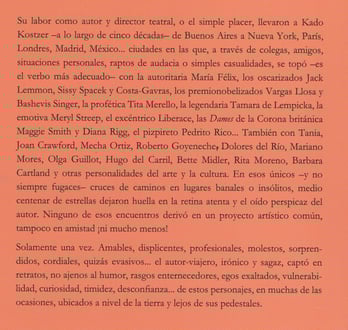 Los más diversos personajes desfilan por este libro y dejan una huella para nuestra curiosidad y asombro… Kado Kostzer no escribe desde el cholulismo. Inquieto, curioso, y testigo de grandes (y no tantos, no por eso menospreciables) momentos del cine, teatro, televisión y literatura, tiene una fascinante mirada que su intensa memoria le permite compartir para llevarnos de paseo a zonas donde de otra manera no llegaríamos jamás.