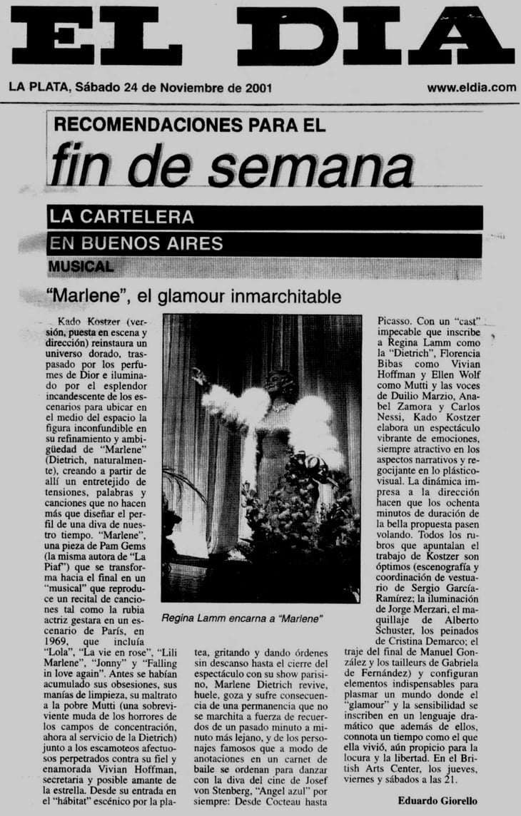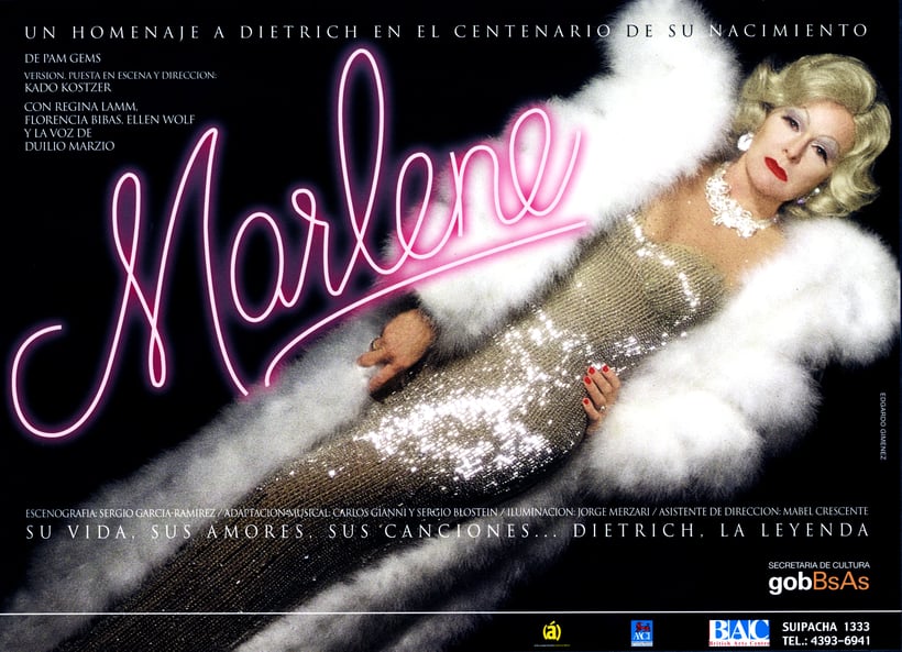 Pam Gems, la internacionalmente exitosa autora de La Piaf, se inspira aquí en otro de los grandes mitos del cine y del music-hall, Marlene Dietrich. La acción nos lleva a un teatro parisino donde la legendaria estrella realizará una de sus últimas apariciones antes de entrar en el ostracismo. La acompañan una vieja servidora Mutti y una joven admiradora. En su camarín invoca a sus amores y a sus amigos célebres. Relata sus experiencias en los sets de Hollywood y en los campos de batalla durante la segunda guerra mundial. La vemos obsesiva por la limpieza, despótica, noble, caprichosa y sobre todo agotada por la mezcla de alcohol y sedantes. La función va comenzar ¿Podrá afrontar a su público? Su tenacidad, su disciplina prusiana y su afán de seducir harán el milagro. Esplendorosa cantará ‘La vie en rose’, ‘Lili Marlen’, ‘Lola’ y ‘Falling in love again’.