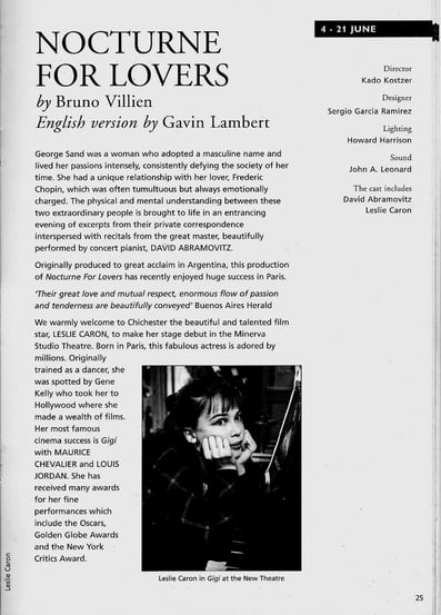 Leslie Caron, la heroína de tantos films inolvidables (Gigi, Lili, Un Americano en París...) la francesita de Hollywood (dirigida por Renoir, Minnelli, Truffaut…) la partenaire de Gene Kelly y Fred Astaire, el objeto del deseo de Dirk Bogarde, David Niven, Cary Grant, Rock Hudson, Warren Beatty…. Conocedora de nuestro trabajo se unió al proyecto de interpretar a George Sand en Un amour qui attend la mort. David Abramovitz, el talentoso concertista internacional, aceptó el rol de Chopin.