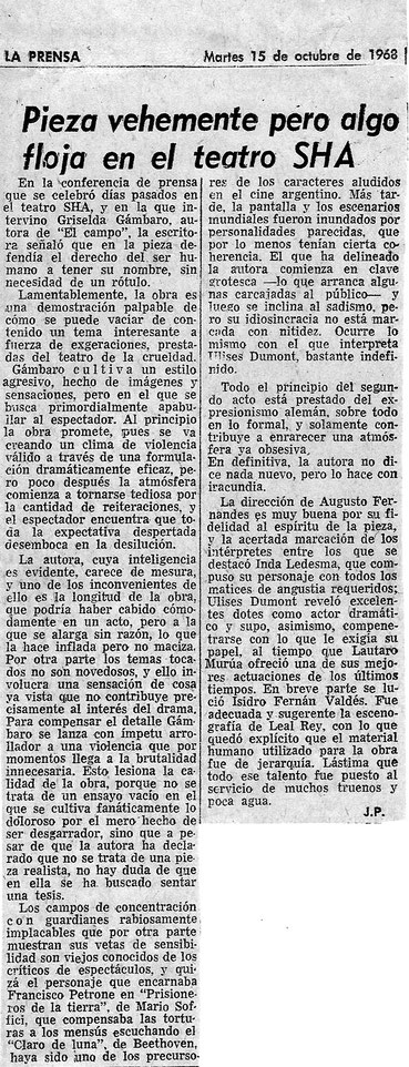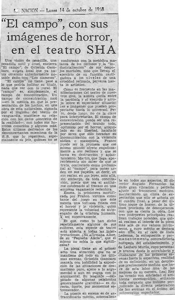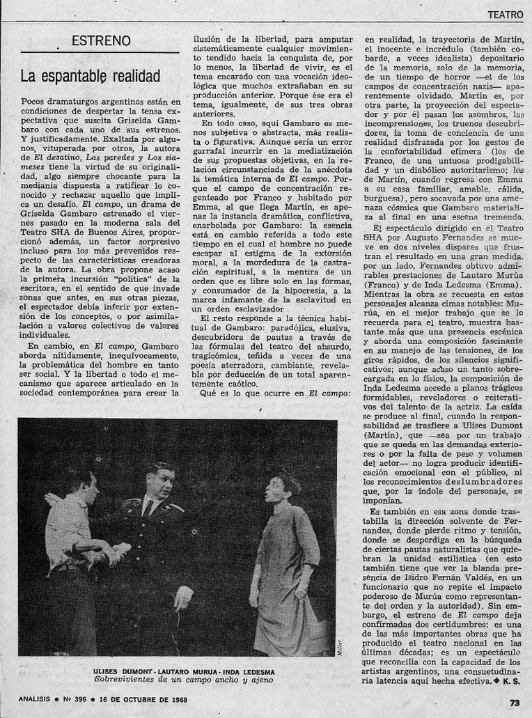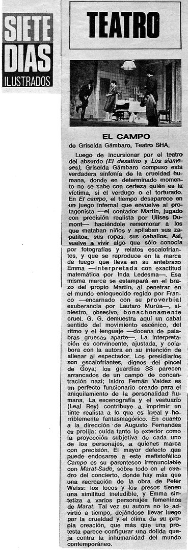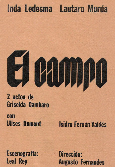 Después del abrupto final de Ubú Encadenado y sin proyectos en Di Tella mi paso siguiente fue integrar el elenco de El Campo. Mi expectativa era grande por la calidad del texto y la aureola del director asignado. La autora, Griselda Gambado, me introdujo a Augusto Fernandes que ya había comenzado ensayos de su obra con los actores principales, Inda Ledesma, Lautaro Murúa y Ulises Dumont. Horacio Romeu y Lorenzo Quinteros, ex Ubúes, también pasaron a formar parte del Grupo de Prisioneros como se llamaban los minúsculos personajes a interpretar. El resto de los pequeños roles eran cubiertos por alumnos del director que era, y es, un respetado maestro de actuación. De más está decir que nosotros estábamos considerados ‘sapos de otro pozo’, como se dice vulgarmente, ya que en esa época no era para nada prestigioso venir del Di Tella. Más bien un terrible handicap. Quizás Fernandes nos aceptó por nuestra larga experiencia en espectáculos basados en el exceso.